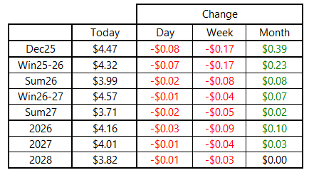 Natural gas futures finished lower across the board after a back-and-forth day of trading that saw the announcement of the first storage withdrawal of the season and minimal changes to near-term weather forecasts. Futures rallied sharply on the front of the curve yesterday, and today gave up roughly half of those gains. For the second straight day, the market was very little changed beyond March 2026.
