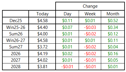 Natural gas futures pushed higher into the weekend, with the December 2025 contract settling on Friday just above week ago levels. This marks the fifth straight weekly gain for prompt-month natural gas, which is the longest such streak in a year. The balance-of-season strip posted a slim weekly loss despite today’s rally, finishing Friday 3 cents behind week-ago levels. Price action remains quiet further out the curve, with minimal back-and-forth this week beyond the winter.