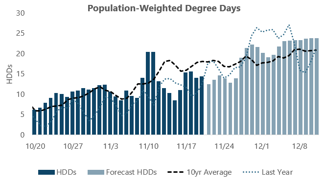 Changes to near-term temperature forecasts were minimal, but we did see some of the cold anomalies backed off in the Southeast near the end of the 14-day period. Even so, The pattern shift for the upcoming week has grown more certain, and the market is anticipating elevated heating load through at least the first week of December. Early-season cold can often set the tone for market psychology for the winter, and the upcoming weather event looks to be conducive of strong storage draws to kick off the peak months.