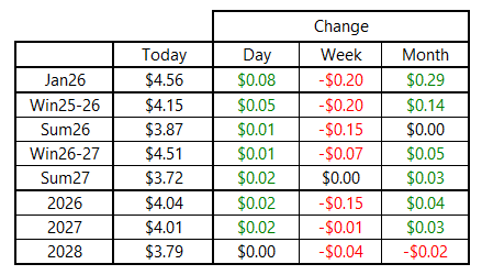 After giving up ground yesterday ahead of the December NYMEX expiration, natural gas futures were back on the rise. Contracts deliverable through the remainder of winter gained back a portion of yesterday’s losses as the remainder of the curve remained relatively flat. Deliveries for Summer 2026 and beyond have been notably quiet in recent weeks, with the vast majority of market volatility focused in the Balance-of-Winter Strip.