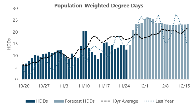 It is somewhat surprising that the market didn’t post stronger gains today given that temperature forecasts pushed colder yet again overnight, and the EIA storage report showed a drawdown in inventories amid a relatively mild week. Since last week, we’ve seen HDDs for early December revised higher. Previous outlooks showed a brief warmup beyond this weekend’s cold snap, but the current forecast now shows the coldest days on December 1–5. While weather is expected to moderate beyond that, expectations still point to cooler-than-normal conditions on average through mid-month.