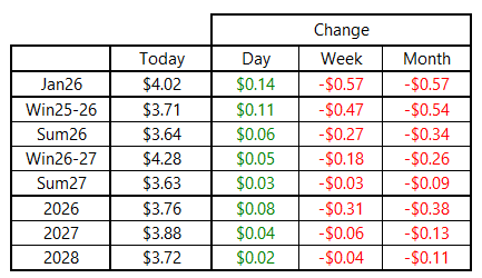 After settling at $4.024 at 2:30pm Eastern, upward momentum continued in after-hours trading, with the January contract ticking as high as $4.110 per MMBtu prior to this posting.