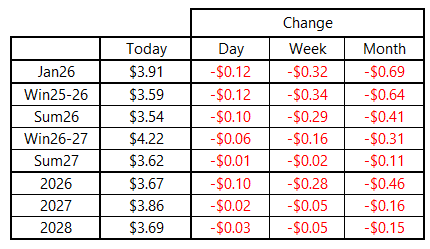 Natural gas prices looked this morning like they were on the verge of the second straight day of gains. However, an “as-expected” storage report and another round of warm model runs helped turn the front of the curve back below $4.00 per MMBtu and return pricing to Wednesday’s lows. The January 2026 contract was as high as $4.218 per MMBtu in early morning trading, but upward momentum faded and prices drifted lower for most of the day. January settled near $3.91 per MMBtu after trading in a daily range of nearly 35 cents.