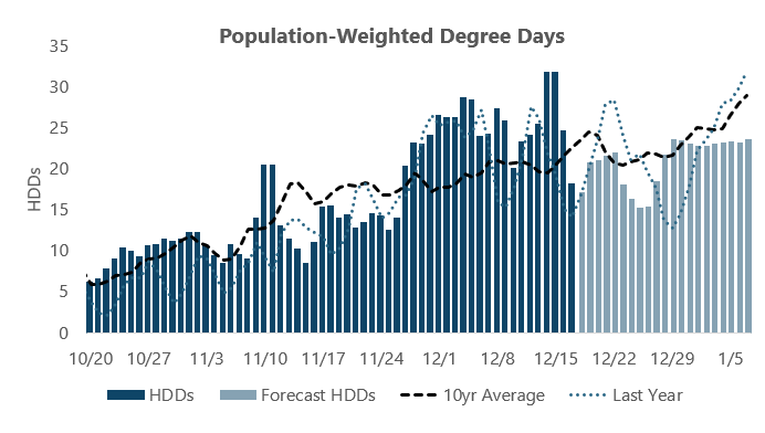 The current near-term forecast shows no major cold events on the horizon, with population-weighted heating degree days expected to remain well below levels observed during the first half of December.
