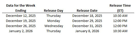 The next two weeks will be unique for the natural gas market in that next week, truncated by the Christmas trading holiday on Thursday, will not feature a Weekly Natural Gas Storage Report data release by the EIA as reported yesterday in an updated Holiday Release Schedule (Link). The following week, also shortened due to the New Year’s Day holiday, will feature two reports separated by only two trading days. The current release schedule is below: