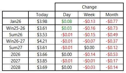 Natural gas prices ended the week mixed, with the January & February 2026 contracts registering gains while the Balance of 2026 lost ground. Calendar 2027 and 2028 saw mixed settlements amid the constituent months, with the annual strips ending the day near unchanged.