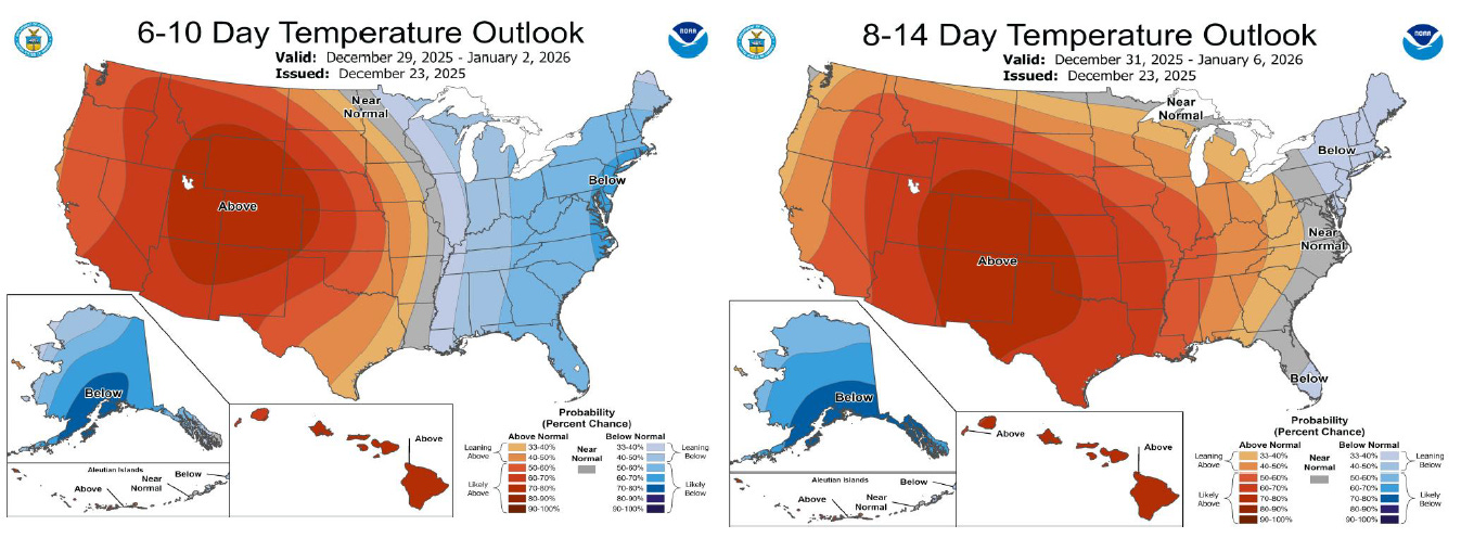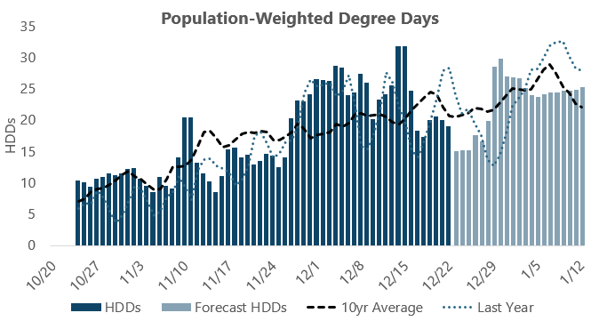 The timing of the cold shift also likely played into the severity of the price increase. With thinner volume expected for the remainder of the week surrounding the Christmas holiday, traders holding profitable short positions were likely compelled to cover and not risk going into the holiday period exposed to the potential for further progression to the upcoming cold in upcoming model runs. The NYMEX market is open on December 24 and 26, but trading activity on these days will likely be lighter than usual.