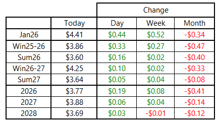Anyone who thought winter was over in mid-December will be sorely disappointed when they look at the newest weather maps. On the heels of a dramatic decline ahead of this week’s historic warmth, natural gas futures rallied sharply on Tuesday, gaining back a large portion of the recent losses. Gains were most prominent on the front of the forward curve, where the January 2026 contract added 44 cents to settle north of $4.40 per MMBtu. Beyond the balance of winter, contracts were still up on the day, but not near as significantly.