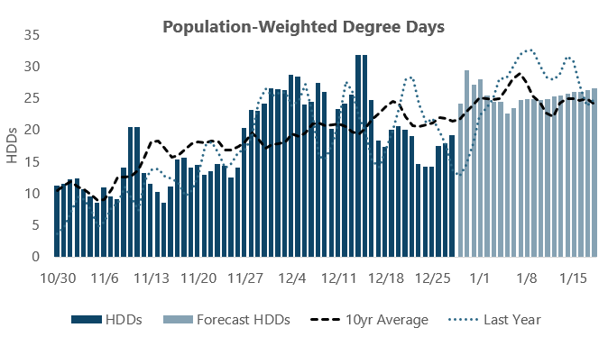 Temperature patterns flipped dramatically overnight across the middle of the country, with frigid weather expected to push east in the coming days. The 1–5 day outlook shows much cooler-than-normal temperatures across the eastern half of the U.S., with anomalies expected to moderate beyond that window. In contrast to forecasts as recently as a week ago—which showed no days with elevated heating degree days (HDDs)—the current outlook keeps HDDs near or above normal for the majority of the two-week period.