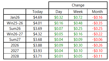 Today’s price action was heavily concentrated at the front of the forward curve, as short positions appeared to be forced to cover ahead of expiration. Gains from February 2026 and beyond were much more muted. February 2026, which will move to the prompt-month position tomorrow, finished the day at $3.986 per MMBtu, just below key psychological resistance at $4.00.