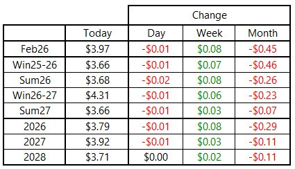 Natural gas futures ended slightly lower today, the first day with the February 2026 contract in the prompt-month position. Early trading saw February futures rally to the highest level in more than 2 weeks, topping out at $4.176 per MMBtu shortly after 9:00am Eastern. Prices moved lower in an orderly fashion through the rest of the session to end the day close to yesterday’s close at $3.972.
