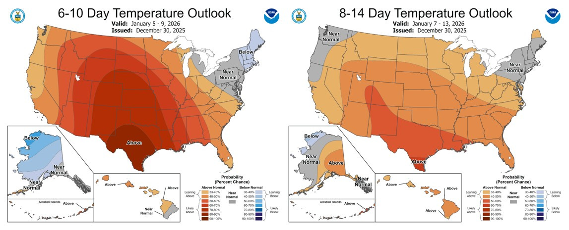 Looking ahead, following a brief cold snap to begin the new year, temperatures are expected to moderate for the first half of January with the warmest anomalies centered over Texas and the Southern half of the country.