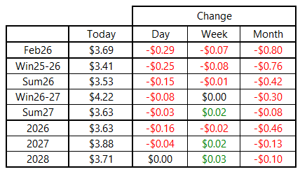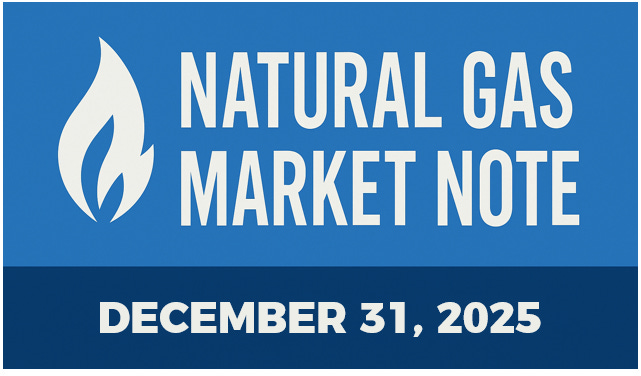 Natural gas prices finished 2025 on a down note, with futures across the curve plunging lower as the market eyed a quick end to the current cold snap. The February 2026 contract lost nearly 30 cents on the day, bringing the prompt-month continuation to its lowest level since October. The two-month balance-of-winter strip remains about 20 cents above its December low, finishing today at $2.41 per MMBtu.