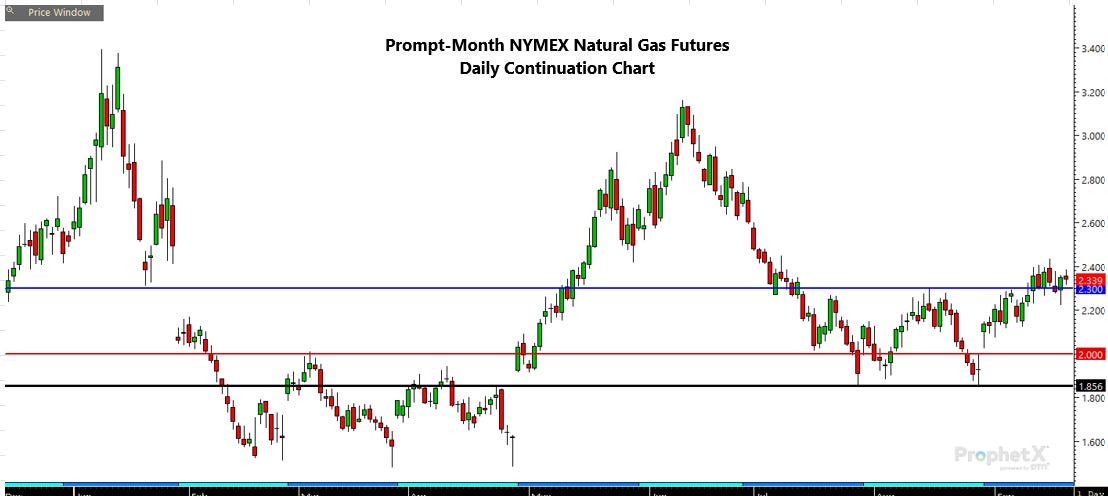 The natural gas market has been in a holding pattern this week, as traders digest a dwindling storage surplus and lower production against seasonal declines in demand. Prices failed to establish any downside momentum below $2.30 per MMBtu, which now looks like a key support level for prompt-month natural gas.