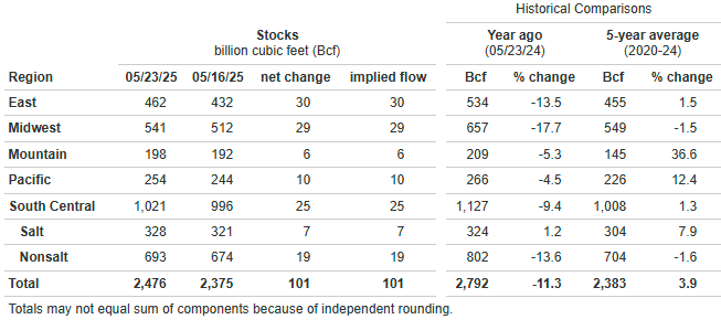 The U.S. Energy Information Administration reported a weekly injection of 101 Billion Cubic Feet (Bcf) in Lower 48 natural gas storage inventories for the week ending May 23, 2025 (Link). Total inventories now stand at 2,479 Bcf, 316 Bcf (11.3%) below year-ago levels and 93 Bcf (3.9%) above the 2020-2024 average for the same week.