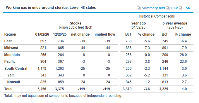 The U.S. Energy Information Administration reported a weekly withdrawal of 119 billion cubic feet (Bcf) in Lower 48 natural gas storage inventories for the week ending January 2, 2026 (Link). Total inventories now stand at 3,256 Bcf, 31 Bcf (1.0%) below year-ago levels and 123 Bcf (3.6%) above the 2021-2025 average for the same week.