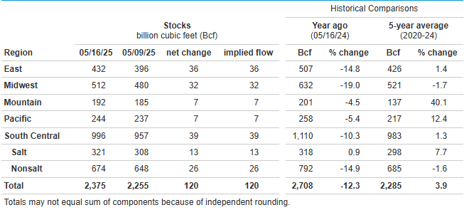 The U.S. Energy Information Administration reported a weekly injection of 120 Billion Cubic Feet (Bcf) in Lower 48 natural gas storage inventories for the week ending May 16, 2025 (Link). Total inventories now stand at 2,375 Bcf, 333 Bcf (12.3%) below year-ago levels and 90 Bcf (3.9%) above the 2020-2024 average for the same week.