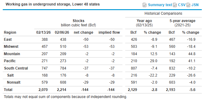 The U.S. Energy Information Administration reported a weekly withdrawal of 144 billion cubic feet (Bcf) in Lower 48 natural gas storage inventories for the week ending February 13, 2026 (Link). Total inventories now stand at 2,070 Bcf, 59 Bcf (2.8%) below year-ago levels and 123 Bcf (5.6%) below the 2021-2025 average for the same week.