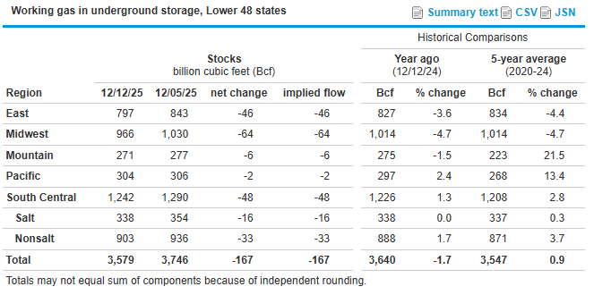 The U.S. Energy Information Administration reported a weekly withdrawal of 167 billion cubic feet (Bcf) in Lower 48 natural gas storage inventories for the week ending December 12, 2025 (Link). Total inventories now stand at 3,579 Bcf, 61 Bcf (1.7%) below year-ago levels and 32 Bcf (0.9%) above the 2020-2024 average for the same week.