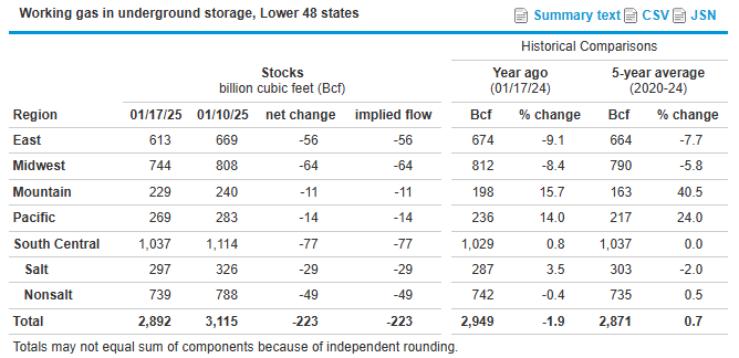 The U.S. Energy Information Administration reported a weekly withdrawal of 223 Billion Cubic Feet (Bcf) in Lower 48 natural gas storage inventories for the week ending January 17, 2025 (Link). Total inventories now stand at 2,892 Bcf, 57 Bcf (1.9%) below year-ago levels and 21 Bcf (0.7%) above the 2019-2023 average for the same week.