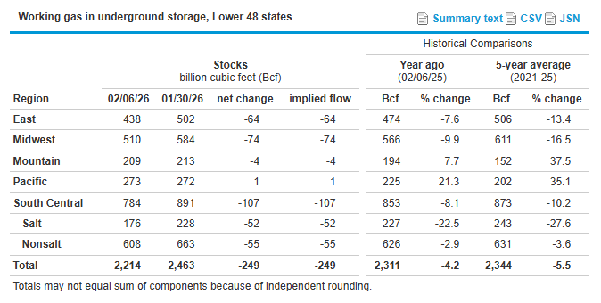 The U.S. Energy Information Administration reported a weekly withdrawal of 249 billion cubic feet (Bcf) in Lower 48 natural gas storage inventories for the week ending February 6, 2026 (Link). Total inventories now stand at 2,214 Bcf, 97 Bcf (4.2%) below year-ago levels and 130 Bcf (5.5%) below the 2021-2025 average for the same week.