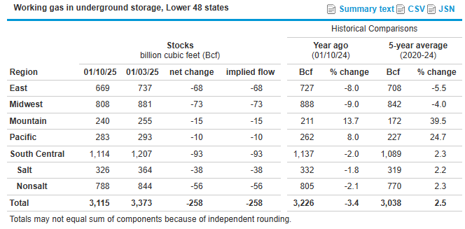 The U.S. Energy Information Administration reported a weekly withdrawal of 258 Billion Cubic Feet (Bcf) in Lower 48 natural gas storage inventories for the week ending January 10, 2025 (Link). Total inventories now stand at 3,115 Bcf, 111 Bcf (3.4%) below year-ago levels and 77 Bcf (2.5%) above the 2019-2023 average for the same week.