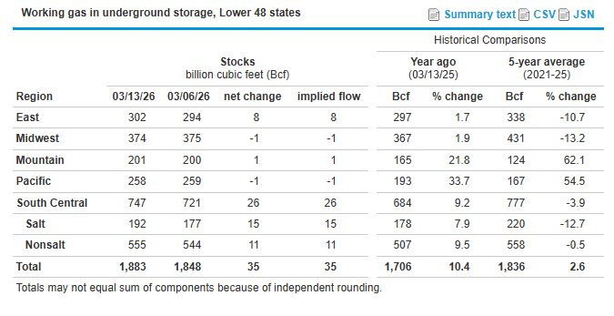 The U.S. Energy Information Administration reported a weekly injection of 35 billion cubic feet (Bcf) from Lower 48 natural gas storage inventories for the week ending March 13, 2026 (Link). Total inventories now stand at 1,883 Bcf, 177 Bcf (10.4%) above year-ago levels and 47 Bcf (2.6%) above the 2021-2025 average for the same week.