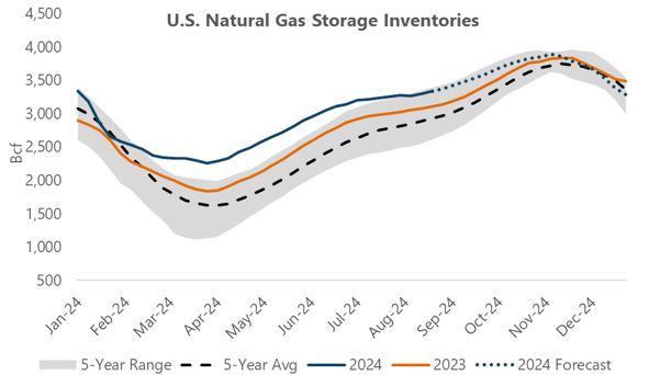 Today is the first day on the front of the forward curve for the October 2024 NYMEX contract, which rolled onto the prompt at a premium of about 17 cents to yesterday’s September expiration of $1.930 per MMBtu. The market reaction to this morning’s data was mostly muted, as benchmark futures pricing was already off of the daily lows prior to the EIA’s 10:30am release. In the half hour following the storage report, the front of the curve is down modestly on the day near $2.08 per MMBtu, with slightly more pronounced declines for deliveries further into the future. Overall, this still has the look of a rangebound market that is largely looking past the balance of summer and focusing on the fall shoulder period and subsequent winter heating season.