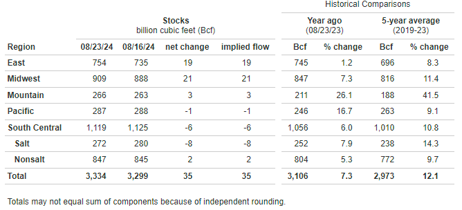 The U.S. Energy Information Administration reported a weekly injection of 35 Billion Cubic Feet (Bcf) in Lower 48 natural gas storage inventories for the week ending August 23, 2024 (Link). Total inventories now stand at 3,334 Bcf, 228 Bcf (7.3%) above year-ago levels and 361 Bcf (12.1%) above the 2019-2023 average for the same week.