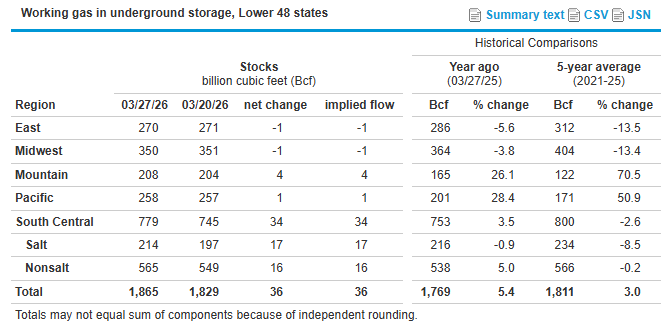 The U.S. Energy Information Administration reported a weekly injection of 36 billion cubic feet (Bcf) from Lower 48 natural gas storage inventories for the week ending March 27, 2026 (Link). Total inventories now stand at 1,865 Bcf, 96 Bcf (5.4%) above year-ago levels and 54 Bcf (3.0%) above the 2021-2025 average for the same week.