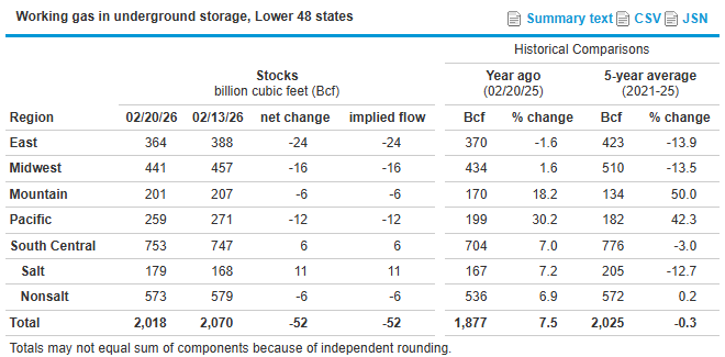 The U.S. Energy Information Administration reported a weekly withdrawal of 52 billion cubic feet (Bcf) in Lower 48 natural gas storage inventories for the week ending February 20, 2026 (Link). Total inventories now stand at 2,018 Bcf, 141 Bcf (7.5%) above year-ago levels and 7 Bcf (0.3%) below the 2021-2025 average for the same week.