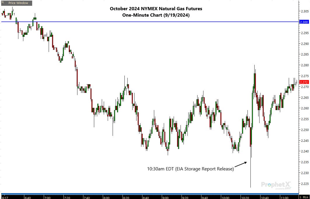 After two straight overtly bullish storage numbers, today’s data represents a bit of a mixed bag. The market’s initial knee jerk reaction was to the downside as the build did come in higher than most market forecasts. However, prices very quickly stabilized and ended up pushing higher than where the market was trading prior to the report as the data was digested. This data still suggests a tight underlying fundamental balance, which is helping to keep a floor under market pricing through the upcoming winter. In the 45 minutes since the storage report was released, the prompt-month October contract has bounced off the daily lows just above $2.22 per MMBtu and is now trading near $2.27, down only modestly from yesterday’s close.
