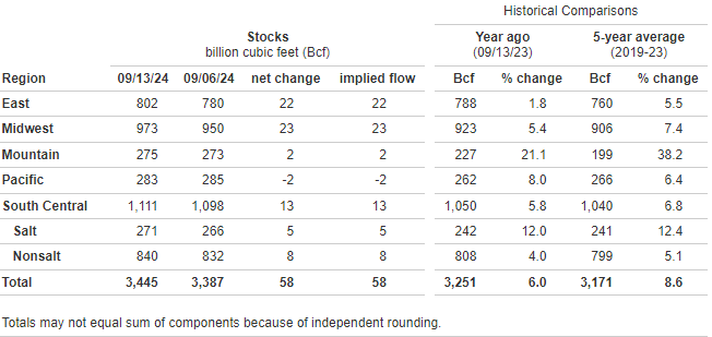 The U.S. Energy Information Administration reported a weekly injection of 58 Billion Cubic Feet (Bcf) in Lower 48 natural gas storage inventories for the week ending September 13, 2024 (Link). Total inventories now stand at 3,445 Bcf, 194 Bcf (6.0%) above year-ago levels and 274 Bcf (8.6%) above the 2019-2023 average for the same week.