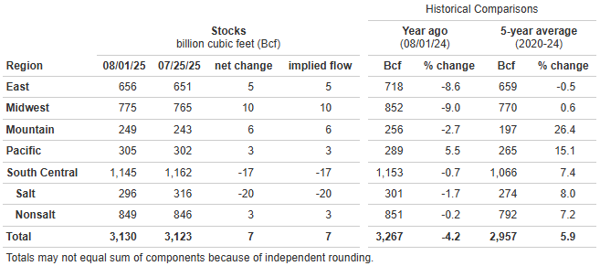 The U.S. Energy Information Administration reported a weekly injection of 7Billion Cubic Feet (Bcf) in Lower 48 natural gas storage inventories for the week ending August 1, 2025 (Link). Total inventories now stand at 3,130 Bcf, 137 Bcf (4.2%) below year-ago levels and 173 Bcf (5.9%) above the 2020-2024 average for the same week.