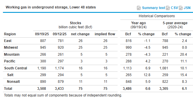 The U.S. Energy Information Administration reported a weekly injection of 75Billion Cubic Feet (Bcf) in Lower 48 natural gas storage inventories for the week ending September 19, 2025 (Link). Total inventories now stand at 3,508 Bcf, 22 Bcf (0.6%) above year-ago levels and 203 Bcf (6.1%) above the 2020-2024 average for the same week.