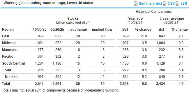 The U.S. Energy Information Administration reported a weekly injection of 80 Billion Cubic Feet (Bcf) in Lower 48 natural gas storage inventories for the week ending October 3, 2025 (Link). Total inventories now stand at 3,641 Bcf, 23 Bcf (0.6%) above year-ago levels and 157 Bcf (4.5%) above the 2020-2024 average for the same week.