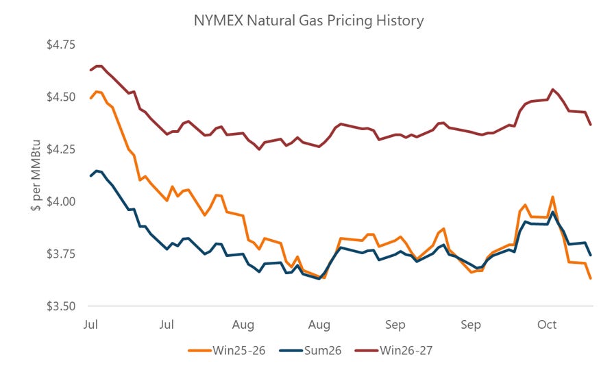 Natural gas futures pricing has declined substantially over the past week, bringing the Winter 2025-26 strip back in line with multiyear lows south of $3.65 per MMBtu – down more than $0.50 per MMBtu from last week’s highs. Forecasts for ongoing mild weather deep into October and healthy storage inventories have helped to weigh on nearby pricing, as the market has largely avoided major risk factors since the beginning of the summer.