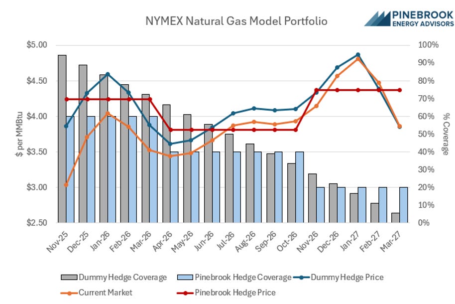 We are adding 40% to the Model Portfolio position for November 2025 through March 2026. This brings total coverage for these months to 80% at a weighted average price just below $4.25 per MMBtu. Beyond that, we are bolstering our position by 20% for April 2026 through October 2026 to bring coverage for those months to 40% at an average price of $3.81. Finally, we are also adding an initial 20% piece to November 2026 through March 2027 to establish the first layer of coverage for those months at $4.37 per MMBtu.